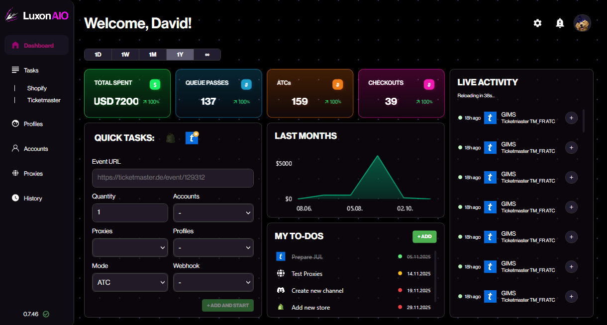Secure Tickets. Beat the Queue. Dominate the Market. Effortlessly automate your purchases for high-demand products & events with LuxonAIO - your ultimate companion.